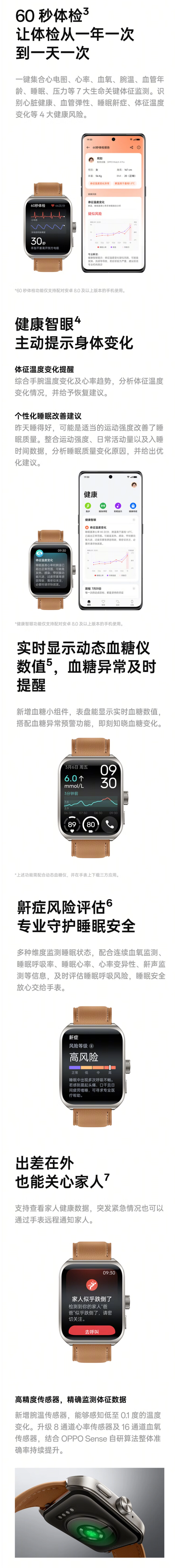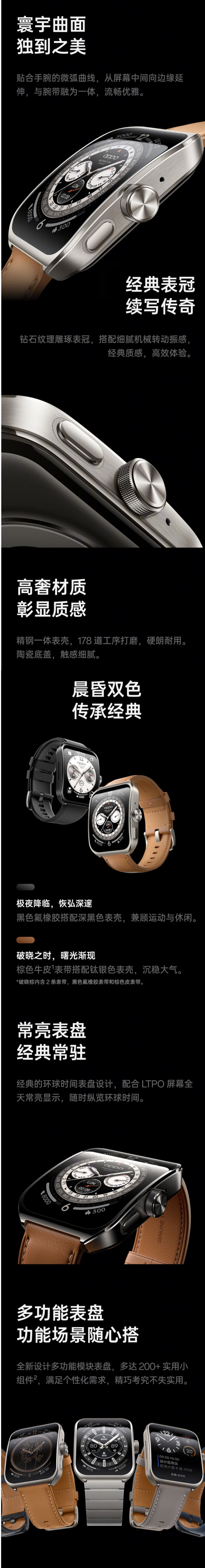 该手表搭载骁龙 W5 和恒玄 2700 两颗旗舰芯片,搭配 2GB 运行内存以及多达 200 + 深度场景优化;内置 570mAh 电池,在全智能模式下可续航 5 天,轻智能模式下续航 14 天;配备高精度传感器,包括心电传感器、腕温传感器、8 通道心率传感器、16 通道血氧传感器,支持 60 秒体检,一键监测 7 个关键体征。