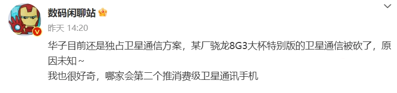 博主 @数码闲聊站 今日爆料称,华为手机目前还是独占卫星通信方案,小米的骁龙 8G3 大杯特别版的卫星通信功能被砍,原因未知。