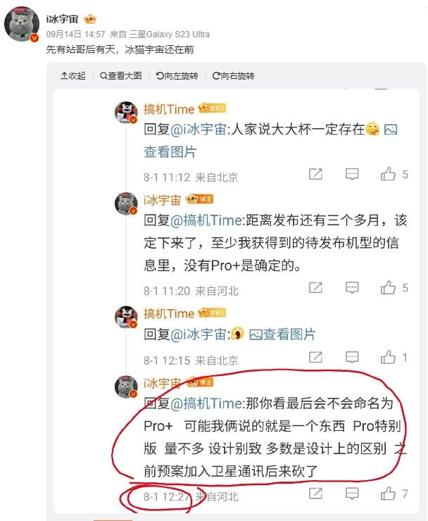 另一位博主 @i 冰宇宙 截图转发了这一消息,他暗示自己早在 8 月透露过类似消息。他当时表示,“Pro 特别版机型量不多,设计别致,(与 Pro 版相比)多数是设计上的区别,之前预案加入卫星通讯后来砍了。”
