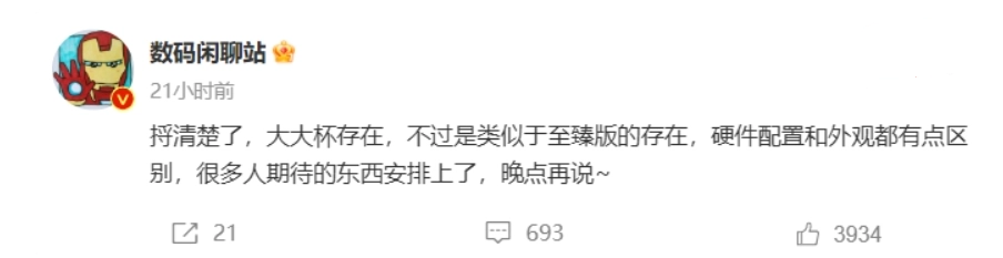 就在同一天,数码博主 @数码闲聊站 也暗示过,小米 14“大大杯”存在,不过是类似于至臻版的存在,硬件配置和外观(与小米 14 其他机型)都有点区别。此外,该博主还曾透露,小米 14 系列手机“基本确定”双十一前发布。
