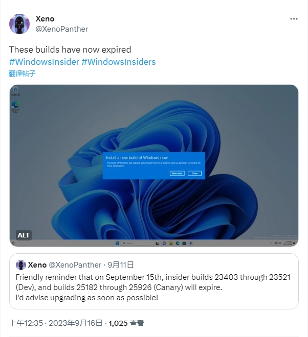 依然运行旧版 Win11 预览版的用户,Dev 频道从 Win11 Build 23403 到 Build 23521,Canary 频道从 Win11 Build 25182 到 25926,今天应该会收到全屏提醒,告知当前版本已经到期,意味着微软接下来不再提供关键的安全补丁和重要的修复程序,推荐用户尽快更新。