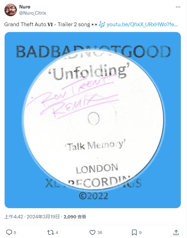 他还表示,R 星准备在 4 月发布《GTA6》第二支预告,第二支预告 BGM 是由加拿大最大的乐队之一 BADBADNOTGOOD 贡献的《Unfolding》,非常符合 GTA 的基调。