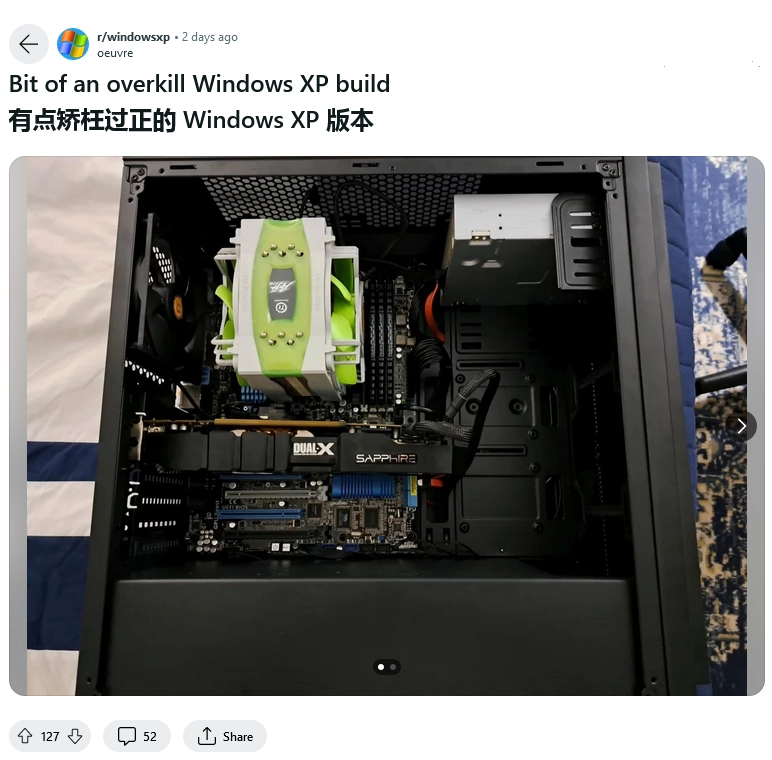 Reddit 社区的 Windows XP 子版块近日非常热闹,起因是一位网友发帖,表示通过改造在相对“现代”的硬件设备上,继续运行 32 位 Windows XP 系统。