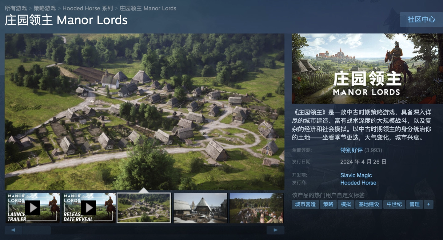 中世纪风格策略游戏《庄园领主(Manor Lords)》目前已经在 Steam 发售,游戏在 Steam 国区首发折扣后价格为 111.75 元。