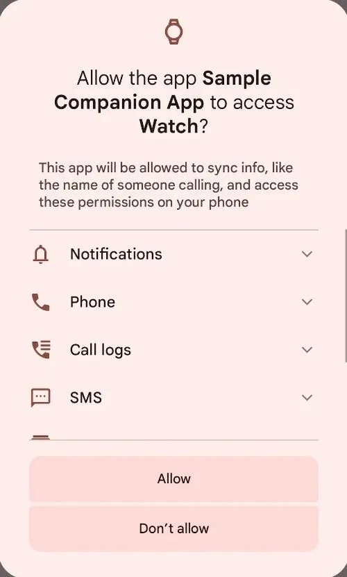 配套应用程序可以利用 Android 的配套设备配置文件功能一次性请求访问这些必要的权限,而不是要求用户单独授予每个权限。
