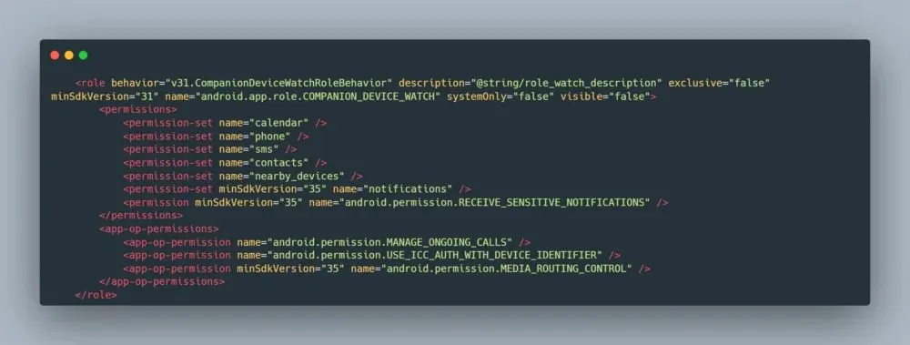 例如,智能手表的配套设备配置文件 android.app.role.COMPANION_DEVICE_WATCH 向配套应用授予与日历访问、电话呼叫访问、短信访问、联系人访问、附近设备扫描等相关的权限。