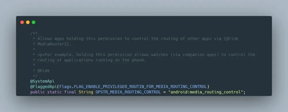MEDIA_ROUTING_CONTROL 权限允许配套应用程序“访问可用设备列表,并控制哪个设备从其他应用程序传输或投屏音频或视频”。