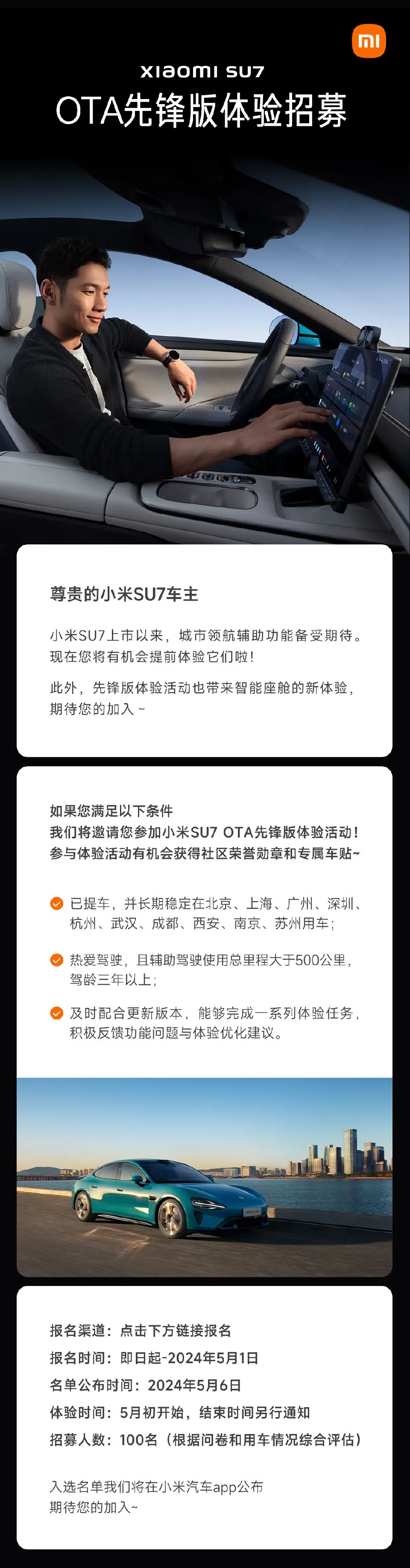 小米官方今日宣布开启小米 SU7 OTA 先锋版体验招募,可以提前体验到小米最新的城市领航辅助功能,并获得智能座舱新体验。IT之家提醒,报名用户需满足以下条件: