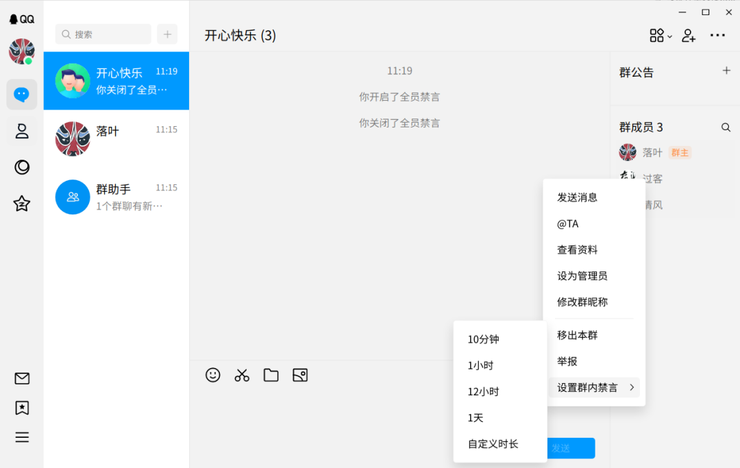 支持全员禁言和单个成员禁言,大大提升 QQ 群管理效率。