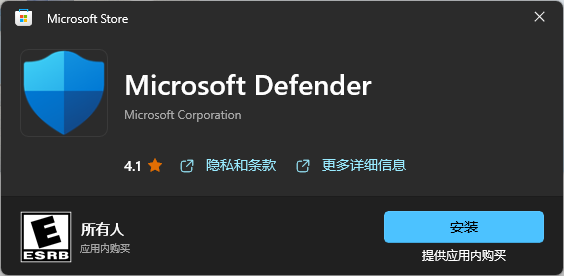 - 打开 Microsoft Store 中的 Microsoft Defender ,然后选择“获取”。(注:基于 ARM 的设备目前不支持 Microsoft Defender)