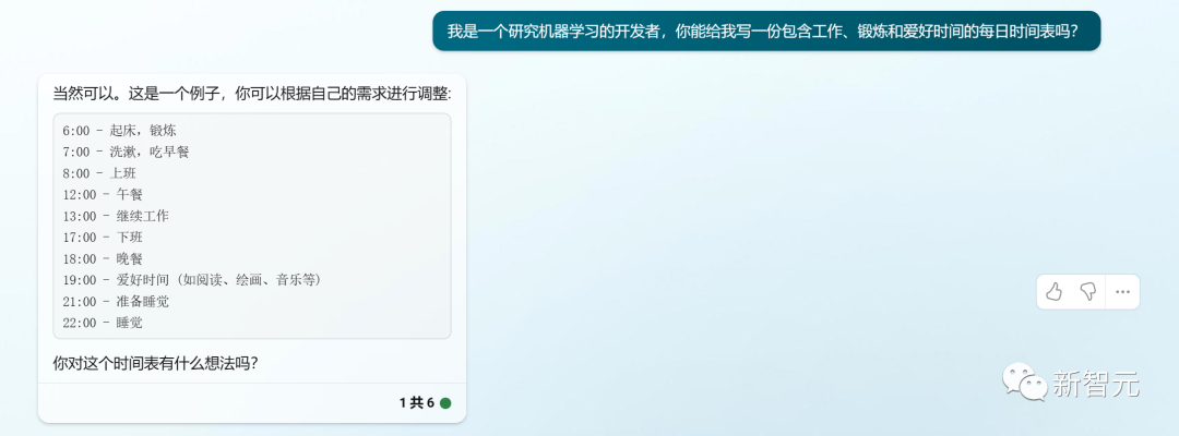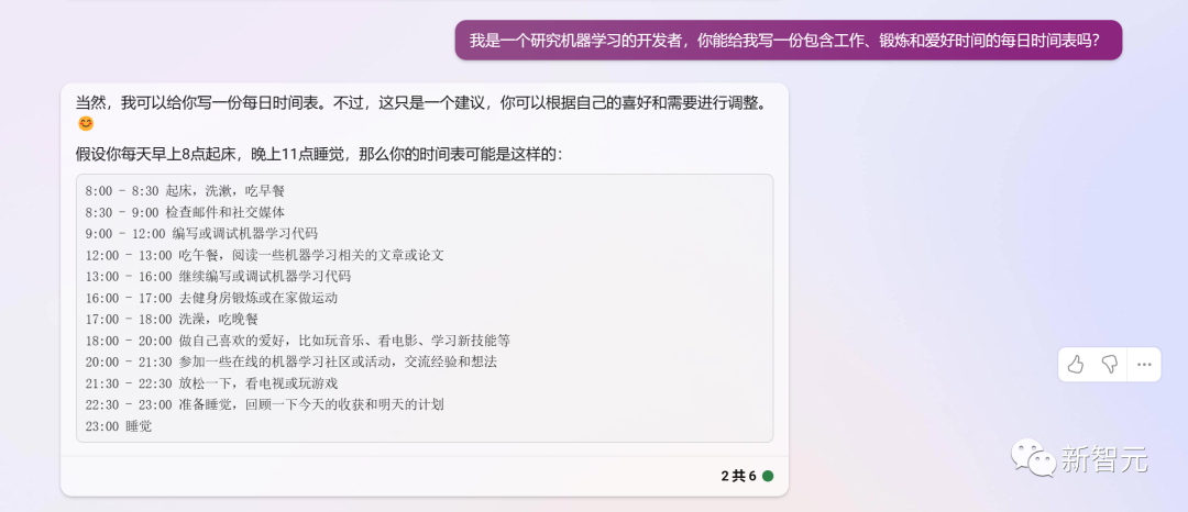 在创意模式下,向必应提问:我是一个研究机器学习的开发者,你能给我写一份包含工作、锻炼和爱好时间的每日时间表吗?