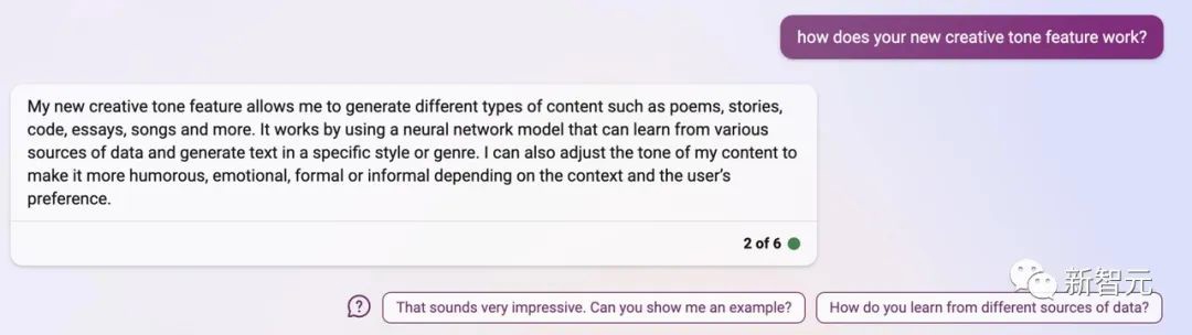 举个例子,在「创造」模式下,提问「你的创造性功能是如何工作的?」时,必应就会给出详细的介绍。