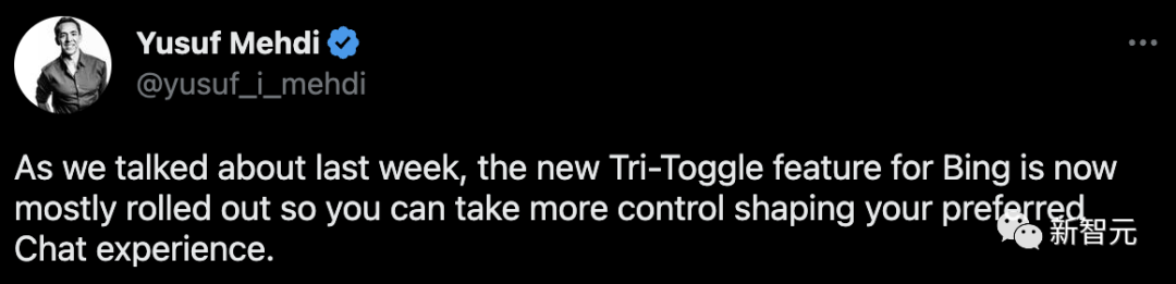 微软副总裁兼首席营销官 Yusuf Mehdi 宣布,经过一周的讨论后,现在,最新的必应有了「三副面孔」,用户可以自由选择自己最喜欢的必应,「私人定制」自己偏爱的聊天体验。
