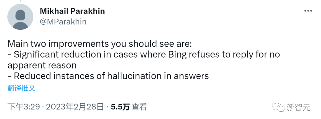 主要的两个改进是:必应无故拒绝回复的情况显著减少;回答中出现幻觉的情况也减少了