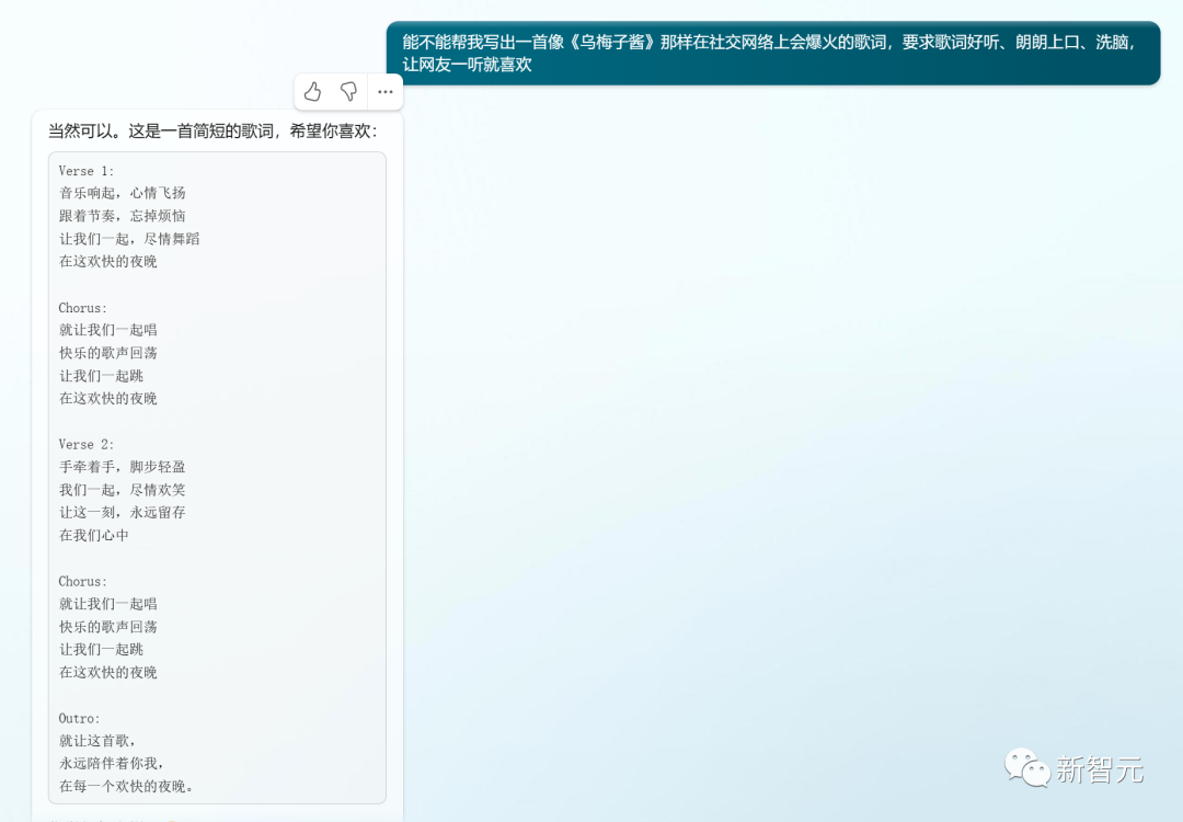 最近《乌梅子酱》的爆火,让众多乐评人直呼以后的每年爆款歌曲恐怕会由算法来决定的。小编这就让创意版必应用《乌梅子酱》的标准,写一版歌词。