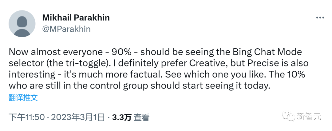 微软的广告和网络服务主管 Mikhail Parakhin 表示,剩余的 10% 用户应该也会马上能用了。他个人更喜欢创意模式,但准确模式也很有意思,因为它更符合事实。