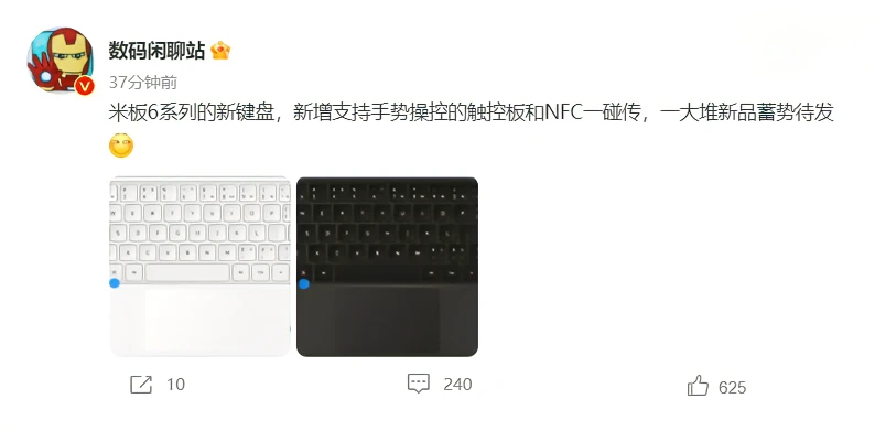 微博博主 @数码闲聊站 爆料,小米平板 6 系列的新键盘,新增支持手势操控的触控板和 NFC 一碰传,一大堆新品蓄势待发。