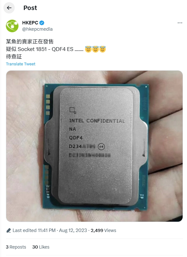 推特博主 wxnod 昨日晚间在推文中展示了一枚特别的 CPU,其与现有的 LGA 1700 CPU(第 12 代 Alder Lake 和第十三代 Raptor Lake)非常相似,但仔细观察后,这枚 CPU 与上述 CPU 其实“大不相同”。