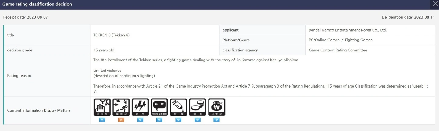 据韩国游戏分级管理委员会网站显示,万代南梦宫格斗游戏《铁拳 7》已于 8 月 11 日通过了评级,获得 15 + 评级。