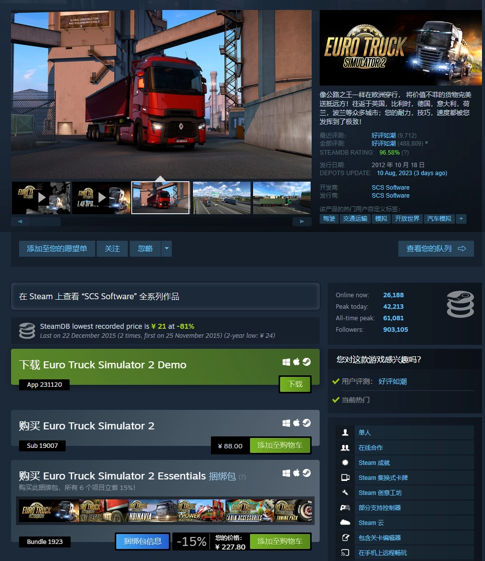 SCS 软件宣布旗下《欧洲卡车模拟 2》与《美国卡车模拟》Steam 国区价格永降,两款游戏基础版已从 108 元降至 88 元,目前均为好评如潮,好评率分别为 97% 和 96%。