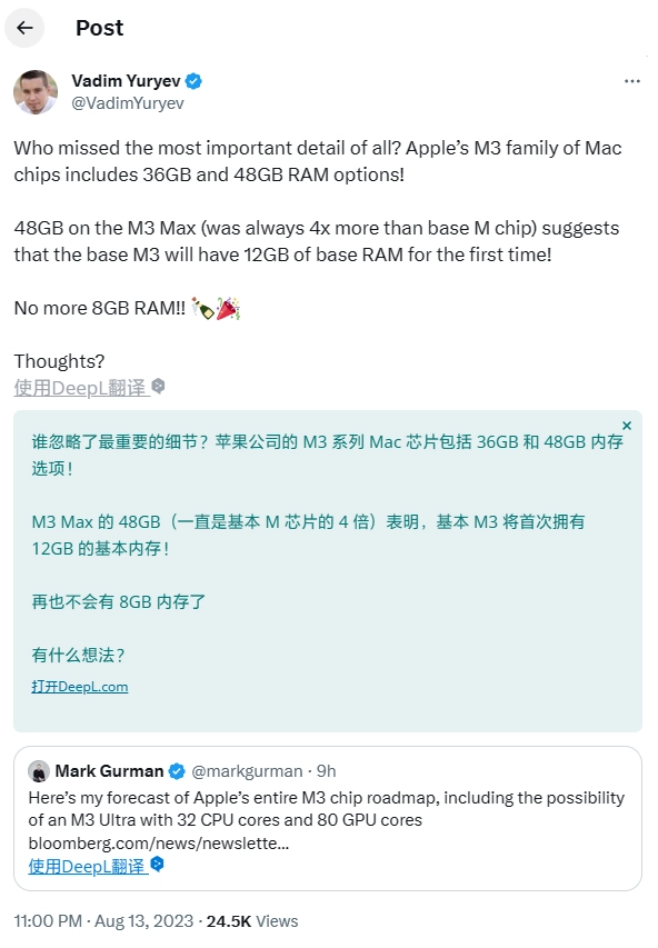 稍晚些时候,另一名苹果报料人 Vadim Yuryev 转发 Gurman 的推文时作出如下补充:“是不是有个最重要的细节被忽略了?M3 Max 配备了 48GB 的内存,这意味着基本版 M3 将首次配备 12GB 内存,再也不会有 8GB 内存了!有什么想法吗?”