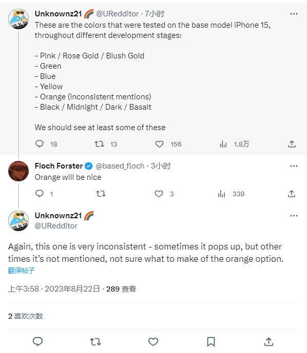 消息源 Unknownz21 今天发布推文,曝光了 iPhone 15 和 iPhone 15 Plus 两款机型的颜色阵容,其中最大的亮点在于粉色 / 玫瑰金,以及橙色。