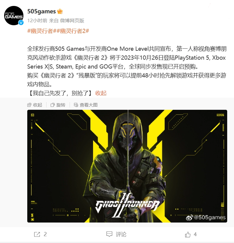 游戏发行商 505 Games 与开发商 One More Level 共同宣布,第一人称视角赛博朋克风动作砍杀游戏《幽灵行者 2》将于 2023 年 10 月 26 日登陆 PlayStation 5、Xbox Series X|S、Steam、Epic 以及 GOG 平台,全球同步发售现已开启预购。