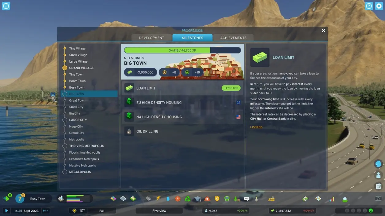 从“超小村庄”到“超级大都会”,本作共有 20 个里程碑可以解锁,每解锁一个里程碑可获得金钱、发展点数、扩展许可,以及解锁新的城市服务、政策和管理选项。随着城市发展,你将需要为市民提供诸如公共交通和通信等更多服务,来满足其增加的需求。