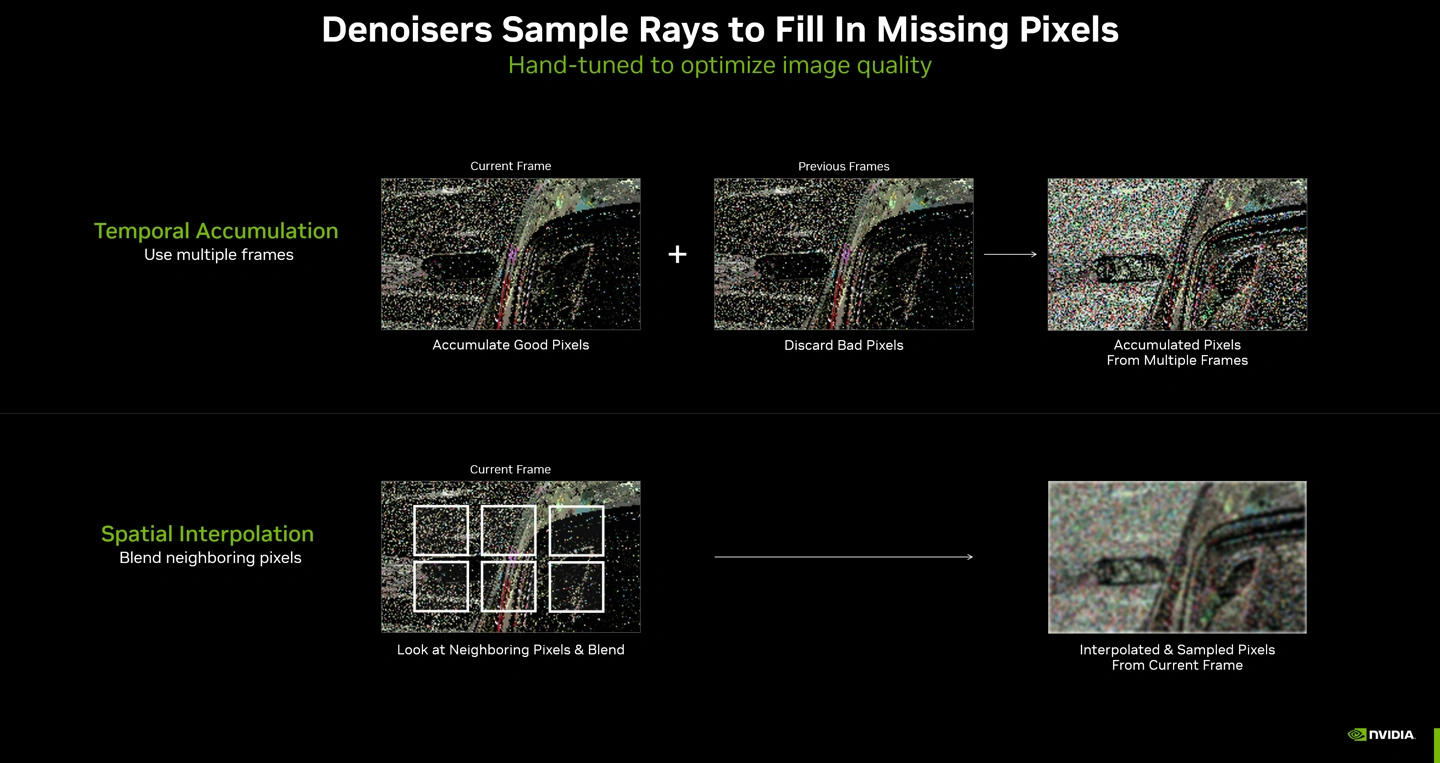 每个需要人工设计的降噪器都会累积多帧的像素以增加细节,实际上是借取过去的光线,但仍存在引入鬼影、消除动态效果并降低其他效果的风险。