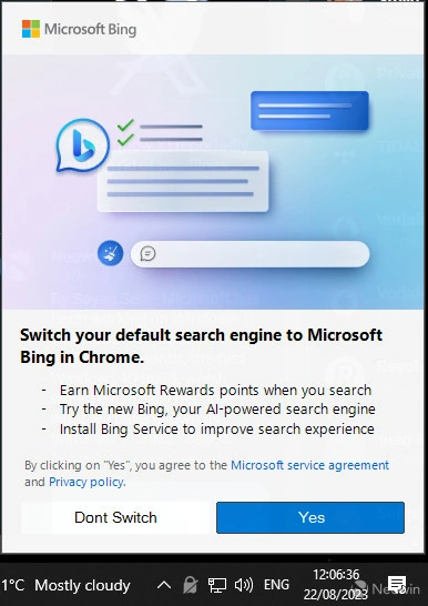 Neowin 网站的联合创始人 Steven Parker 今天早上在自己的 Windows 10 电脑上发现了这个广告。这个广告用了一些诱惑手段,比如承诺“改善搜索体验”、“赠送微软奖励积分”、“提供新的人工智能驱动的 Bing”等。IT之家注意到,不像 Windows 11 升级提示只有两个“是”的按钮,这次的广告还允许用户用“不切换”的按钮拒绝这个提议。据悉,这个广告最早出现在 2023 年 6 月。