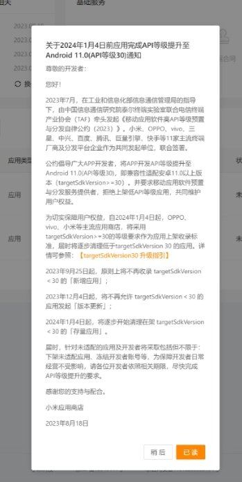 小米应用商店近日向开发者推送了《关于 2024 年 1 月 4 日前应用完成 API 等级提升至 Android 11.0(API 等级 30)通知》。