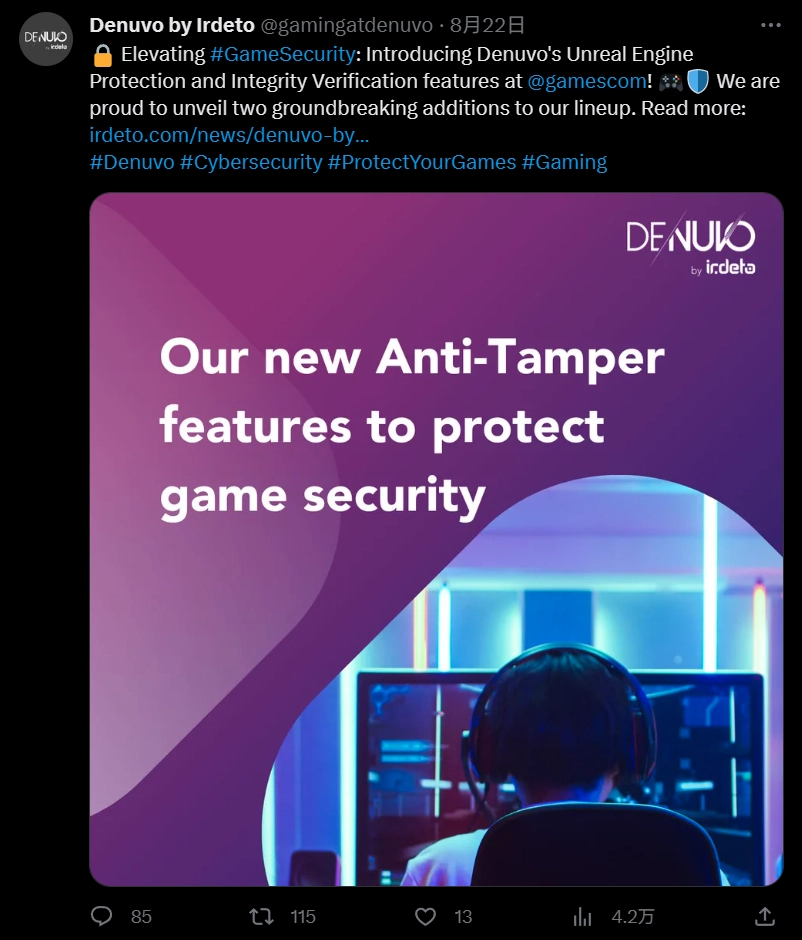 Denuvo 日前推出了一项名为“虚幻引擎保护”的新功能,Denuvo 表示,该功能可以在二进制层面上集成到游戏中,从而“有效地挫败数据挖掘企图,并针对作弊者、盗版者和欺诈者建立强大的壁垒”。
