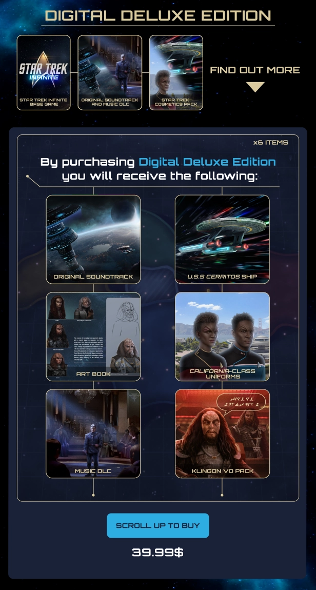 《星际迷航:无限》是一款宏大的策略游戏,玩家将扮演银河系四个主要派系之一的领袖,打造自己的星际迷航故事。跟随特别设计的剧情,探索《星际迷航:无限》的故事,或是在第一款《星际迷航》题材的宏大策略游戏中开创自己的道路。